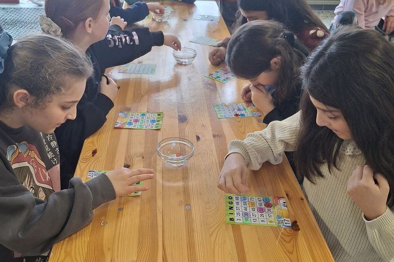 Jedes Kind bekam eine eigene Spielkarte und hoffte, dass die eigenen Zahlen genannt wurden - 5 aus 75 bzw. 4 aus 20 mussten gelegt werden. Gespannt und aufmerksam lauschten sie den Zahlen, die im Wechsel von Rachel Pardo und Corinna Hartmann genannt wurden. Nun bloß nicht vor Aufregung “Bingo!” rufen, bevor alle Zahlen gelegt worden sind. Das ein oder andere Kind hielt es kaum auf der Bank. Zum Glück gab es für jedes Kind ein kleines Präsent, gerade für die letzten Mitspielenden, war es kaum auszuhalten, wenn die eigenen Zahlen einfach nicht aus dem Spielrad fallen wollten.